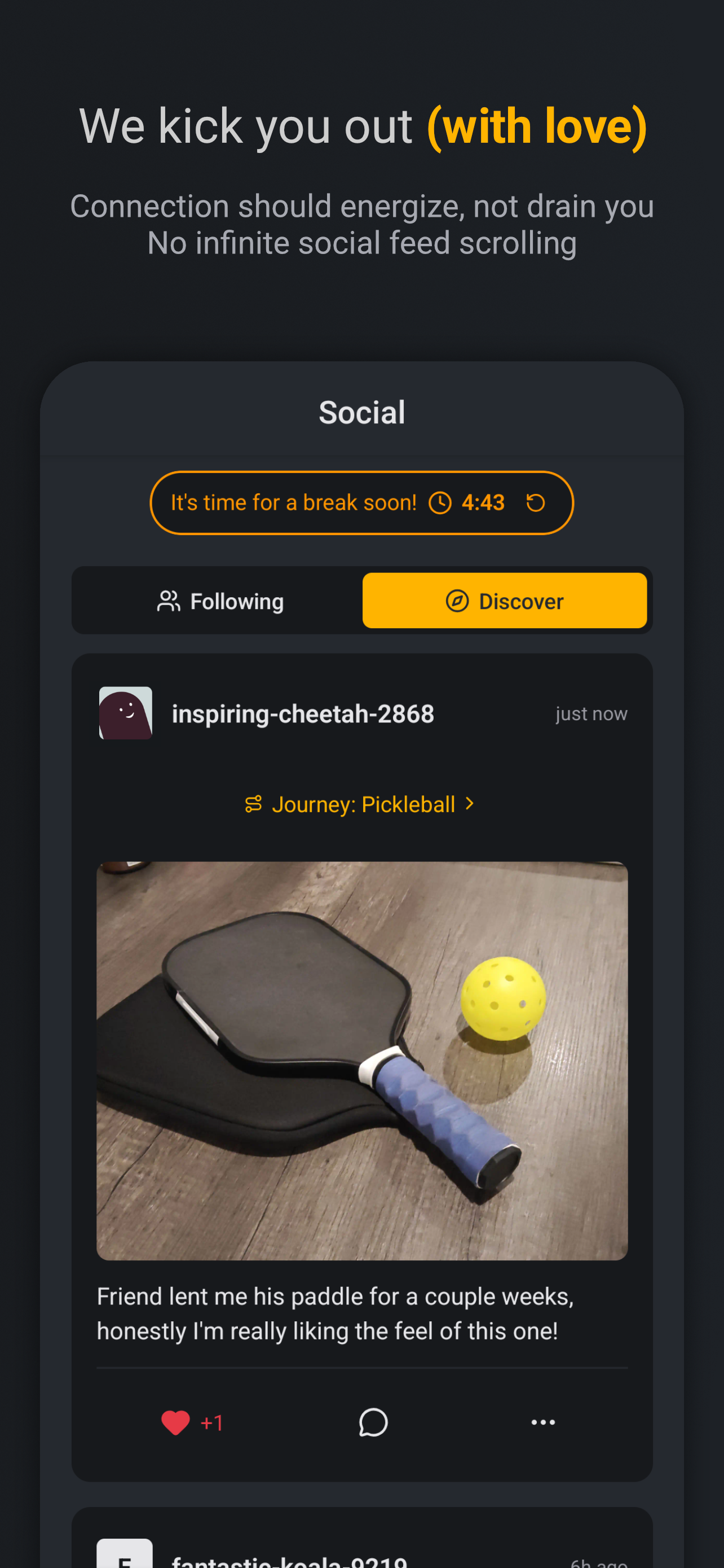 The social feed has a time limit so you can't doomscroll forever. Share, connect, and get inspired, then get back to your goals. Connection should energize you, not drain you. We designed this space to help you stay mindful of your time and your attention — no endless feeds, no manipulative algorithms, no distractions disguised as engagement.